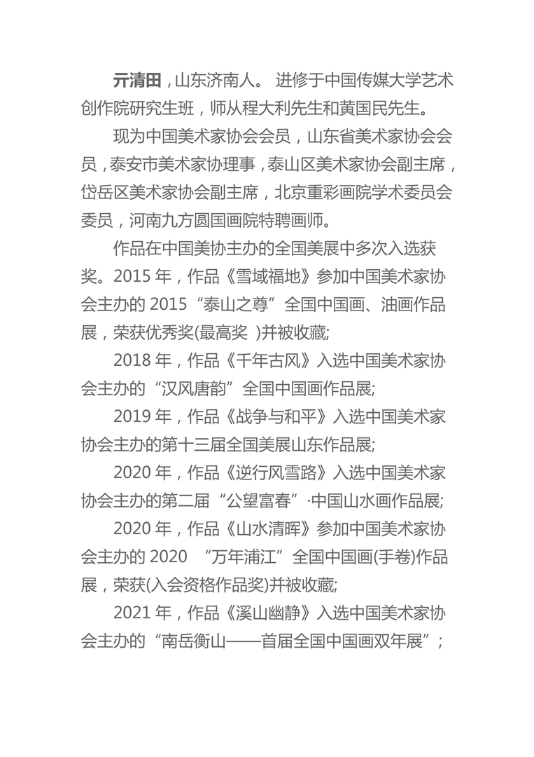 2021年,作品《溪山幽静》入选中国美术家协会主办的“南岳衡山——首届全国中国画双年展”;